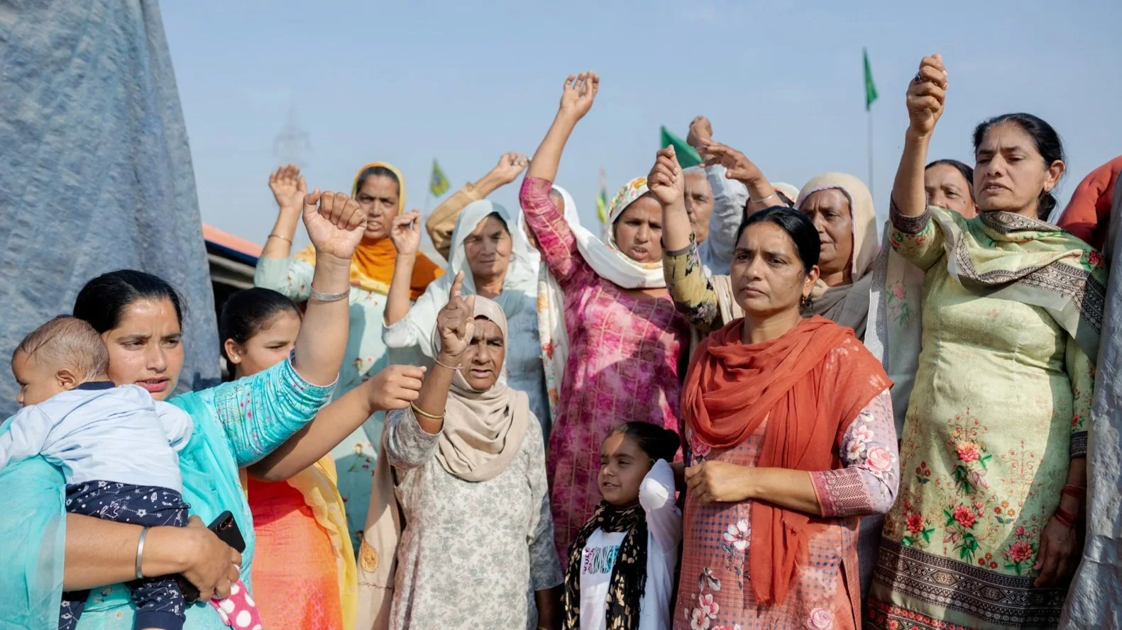 Image from TIME Magazine: Kiranjit Kaur, far left, came to the Tikri protest site from Talwandi, Punjab, on Feb. 23 with a group of 20 women, including her mother-in-law and children. “It is important for all women to come here and mark their presence in this movement. I have two daughters, and I want them to grow up into the strong women they see here.” Kanishka Sonthalia for TIME